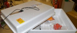 The body of the device is made of polystyrene foam, which has decent thermal insulation. Thanks to it, optimal temperature conditions are ensured inside the incubator. The inside of the incubator is heated using metal heating elements specially designed for this purpose. There is a sensor (thermostat) on the lid of the device, with the help of which the temperature inside is properly regulated. As soon as it drops below the permissible value during the incubation process, heating is immediately turned on.